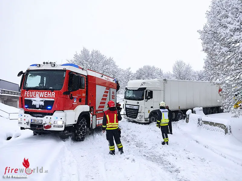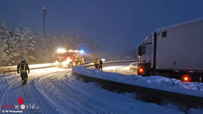 PINKAFELD (BGLD): In der Nacht auf den 9. Dezember 2021 begann es im gesamten Bezirk Oberwart sehr stark zu schneien. In den frühen Morgenstunden (05:30 Uhr) wurde die FF Pinkafeld mittels Rufempfänger zu einer Lkw-Bergung auf die A2 (Südautobahn) alarmiert.