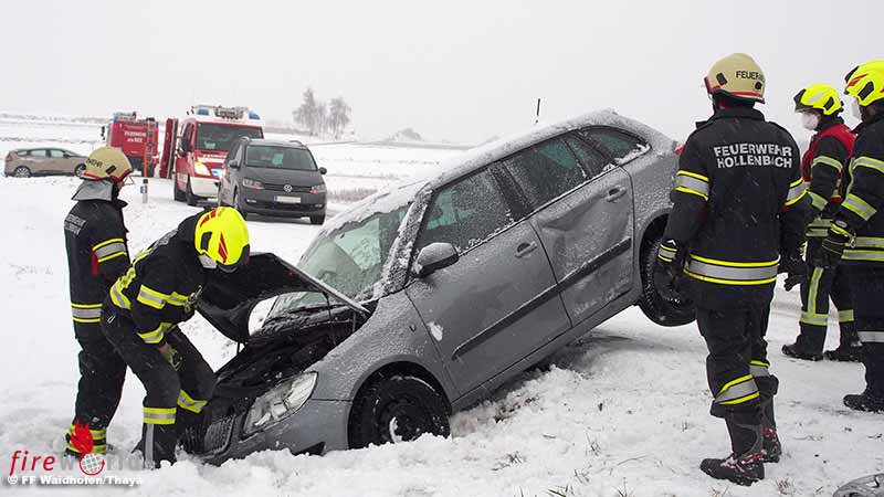 Aus bislang unbekannter Ursache kam es auf der Landesstraße 59 zwischen Hollenbach und Altwaidhofen zu einem Zusammenstoß zweier Pkws. Durch die Wucht des Zusammenstoßes wurde ein Skoda Fabia in den Straßengraben geschleudert. Der zweite beteiligte Wagen – ein Renault Clio – kam auf der schneebedeckten Fahrbahn zum Stillstand. Alle Insassen blieben bei diesem Unfall unverletzt.