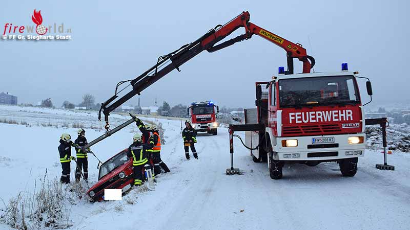 Ein Fahrzeug kam von der schneeglatten Straße ab und rutschte in den Graben. Es wurde niemand veletzt. Die Straße wurde für die Dauer des Einsatzes abgesichert und gesperrt. Das Fahrzeug mithilfe des Krans von Last Gr. Siegharts geborgen.