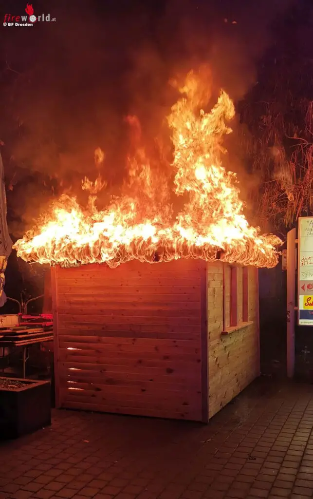 D: Feuerwehr Dresden: Brennender Holzimbiss, Person auf Kranausleger, brennender Altkleidercontainer, brennende Bahnschwellen