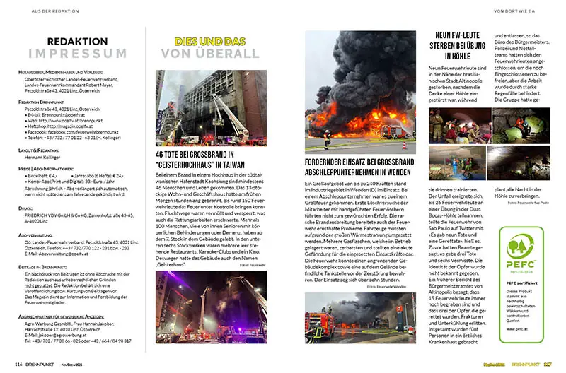 Kurz vor Weihnachten erscheint die letzte Ausgabe des Feuerwehrfachmagazins Brennpunkt für das Jahr 2021, die Nummer 6. Neben mehr als 120 informativen Seiten wartet darin auch wiederum der Riesen-Wandkalender für das kommende Jahr.