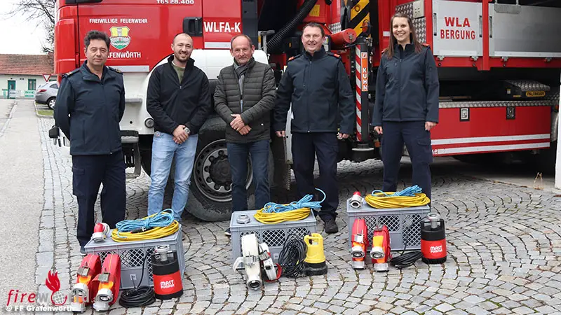 Mit MST Martin Steurer Installationen & Freizeit GmbH und der Fass- und Bottichmanufaktur G. Benninger OG meldeten sich gleich zwei Grafenwörther Unternehmen mit dem Angebot die Feuerwehr finanziell zu unterstützen. Die sehr großzügigen Spenden ermöglichten die Beschaffung von drei Sets mit Unterwasserpumpen, Schläuchen und Zubehör zum Einsatz bei den immer häufiger werdenden Unwettern.