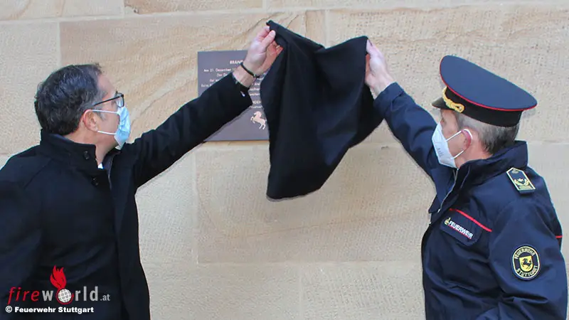 D: Gedenktafel zum 90. Jahrestag des Schlossbrandes Stuttgart mit drei toten Feuerwehrleuten enthüllt