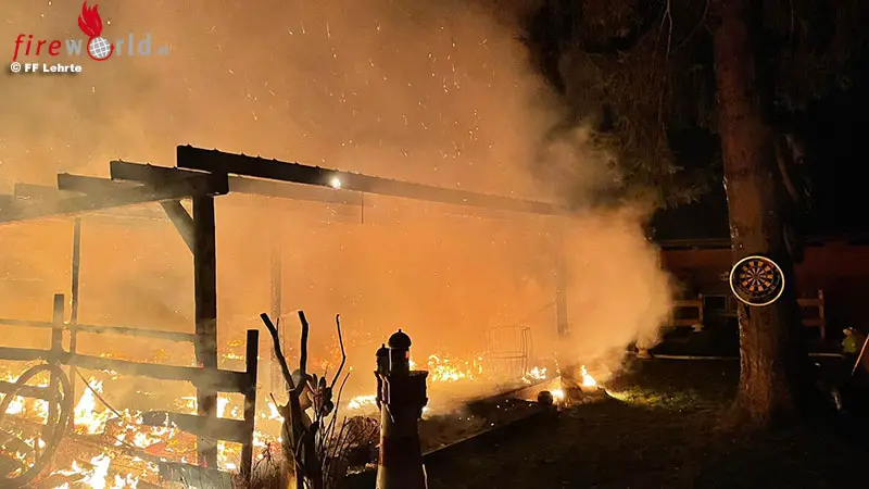 LEHRTE (DEUTSCHLAND): Gegen 22:10 Uhr des 22. Dezember 2021 wurden die Feuerwehren aus Sievershausen und Arpke zu einem gemeldeten Schuppenbrand alarmiert. Bei Eintreffen der ersten Einsatzkräfte stand bereits eine ca. 50 qm große Überdachung in Vollbrand.