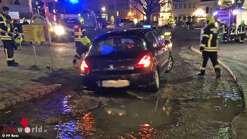 RETZ (NÖ): Die Feuerwehr Retz wurde am 10. Jänner 2022 um 18:27 Uhr zu einem technischem Einsatz am Retzer Hauptplatz alarmiert. Ein Auto war aufgrund eines Gebrechens an einer unterirdischen Wasserleitung im aufgeweichten Boden eingesunken.