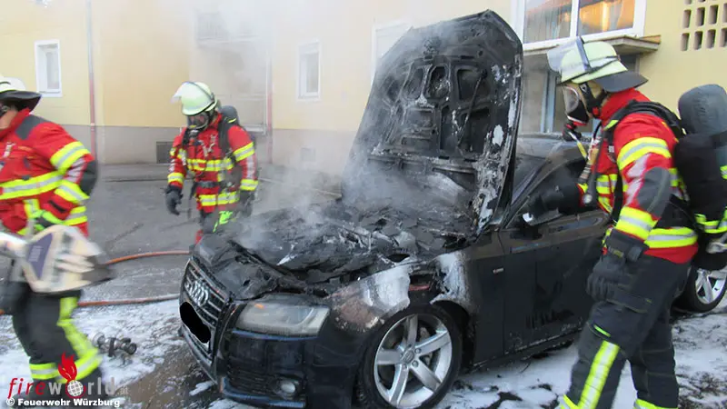 In den Vormittag Stunden wurde der Integrierten Leitstelle Würzburg ein brennender Pkw in einem Hinterhof im Stadtteil Zellerau gemeldet. Noch während der Anfahrt der alarmierten Feuerwehrkräfte kam die Info – Fahrzeug im Vollbrand.