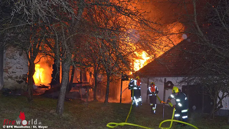 Die höchste Alarmstufe musste fünf Tage später bei einem Großbrand im Ortszentrum von Kainraths (Gemeinde Waidhofen an der Thaya – Land ) ausgelöst werden. Ein landwirtschaftliches Gebäude stand in Vollbrand. Der starke Wind und mehrere Gasflaschen im Gebäude erschwerte den 140 Feuerwehrleuten den Einsatz. Es bestand höchste Explosionsgefahr. Während der Löscharbeiten fand ein Atemschutztrupp eine ausgebrannte Gasflasche, zwei weitere wurden geborgen und gekühlt. Verletzt wurde zum Glück niemand, eld Feuerwehren waren eingesetzt.