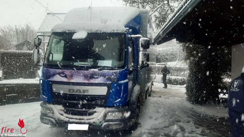 BAD ISCHL (OÖ): Am Dienstagvormittag, 1. Februar 2022, geriet ein Lkw-Lenker mit seinem Fahrzeug auf der Kreuzung Thomas Ender Weg/Lindaustraße ins Rutschen und blieb in einer gegenüberliegenden Hauszufahrt hängen. Der Lkw touchierte dabei ein Garagendach und beschädigte dieses leicht.