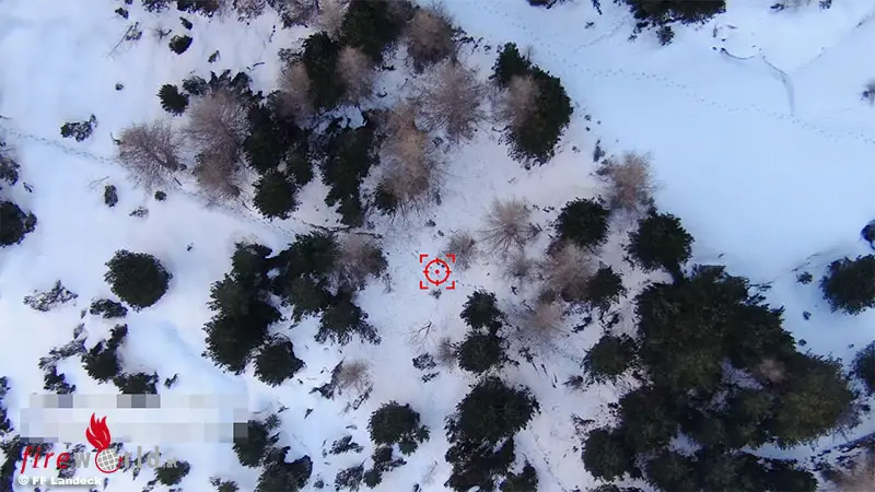 Der letzte Flugauftrag für die Drohne Landeck erwies sich dann jedoch als Erfolg: Ein Bergretter hat aus großer Entfernung unklare Spuren entdeckt – die Drohne Landeck hat diese dann definitiv als menschlich identifizieren und über einen weiten und teilweise sehr unklaren, Verlauf bis in sehr steiles und vereistes Gelände verfolgen können.