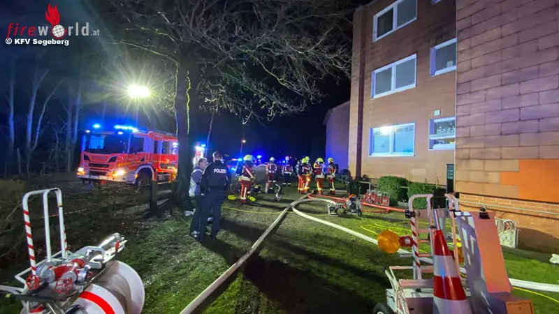 Umgehend wurde das Einsatzstichwort auf „Feuer, mit Menschenleben in Gefahr erhöht“. Beim Eintreffen der Feuerwehr wurde vorrangig die Menschenrettung der sich noch in den Wohnungen befindlichen Bewohnern durchgeführt. Gleichzeitig wurde das Teleskopmastfahrzeug in Stellung gebracht, um Menschen aus den Obergeschossen retten zu können. Ein Bewohner wurde durch den Treppenraum gerettet.