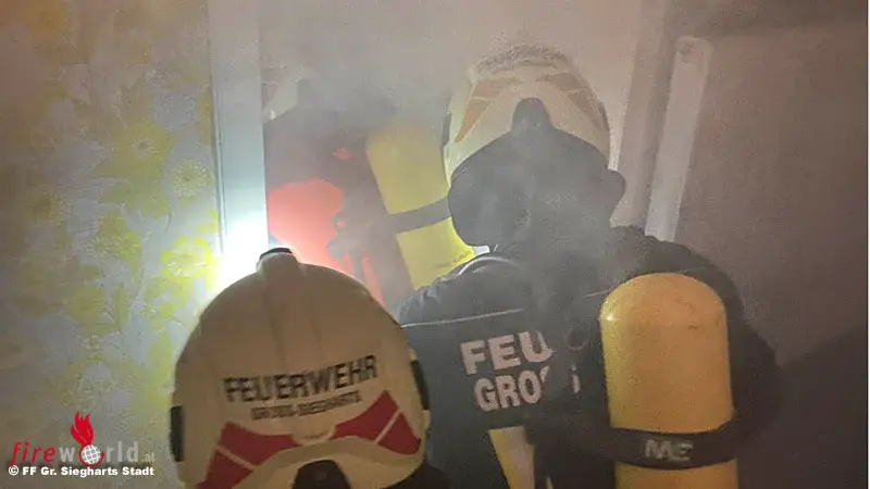 Währenddessen wird mittels Leiter durch ein Fenster im Obergeschoss eingestiegen und eine eventuelle Rettung über die Leiter vorbereitet. Da der Brand aber rasch gelöscht werden konnte und die Rauchentwicklung weniger wurde, konnten die beiden Personen im Obergeschoss mittels Fluchthauben durch den Atemschutztrupp gerettet werden.