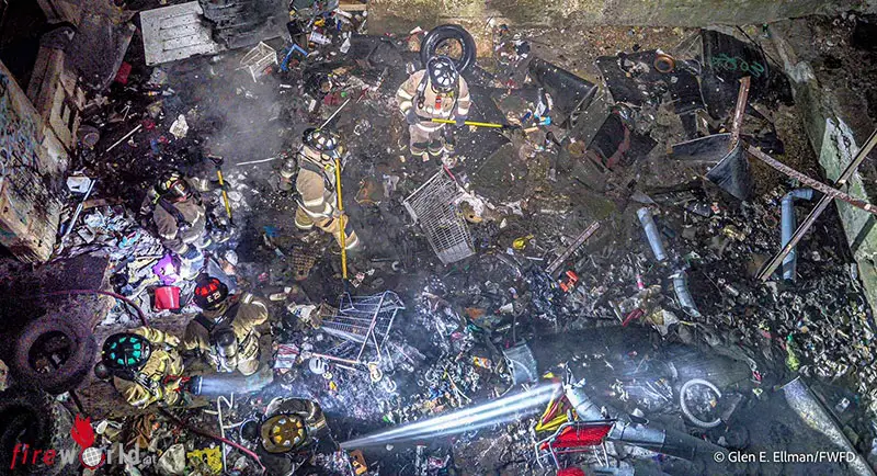 Die Besatzungen benutzten die Leiter von Quint 17 und fanden schließlich große Müllhaufen, die in Flammen standen.