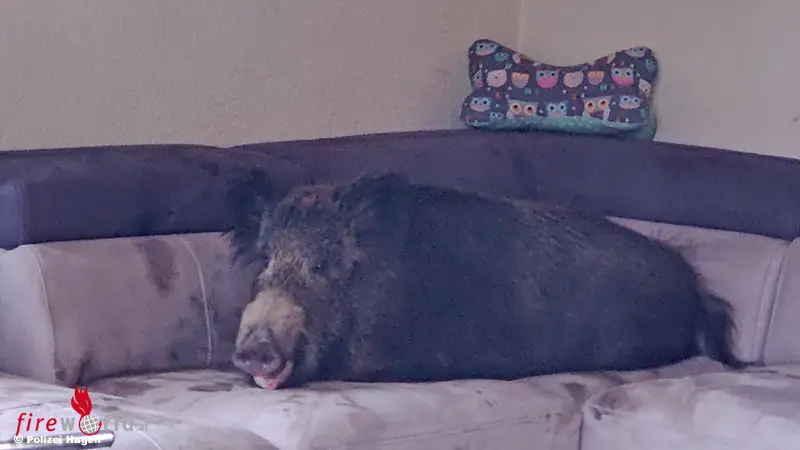 Als die 39-Jährige die Haustür im Erdgeschoss öffnete, stand drei Meter von ihr entfernt ein Wildschwein. Zum Glück mit dem Haupt von ihr abgewandt. Die Frau schloss schnell die Tür und rief die Polizei. Eine Streifenwagenbesatzung war rasch vor Ort. Zwischenzeitlich hatte die stattliche Bache die Einrichtung verwüstet und es sich anschließend auf dem Wohnzimmersofa bequem gemacht.