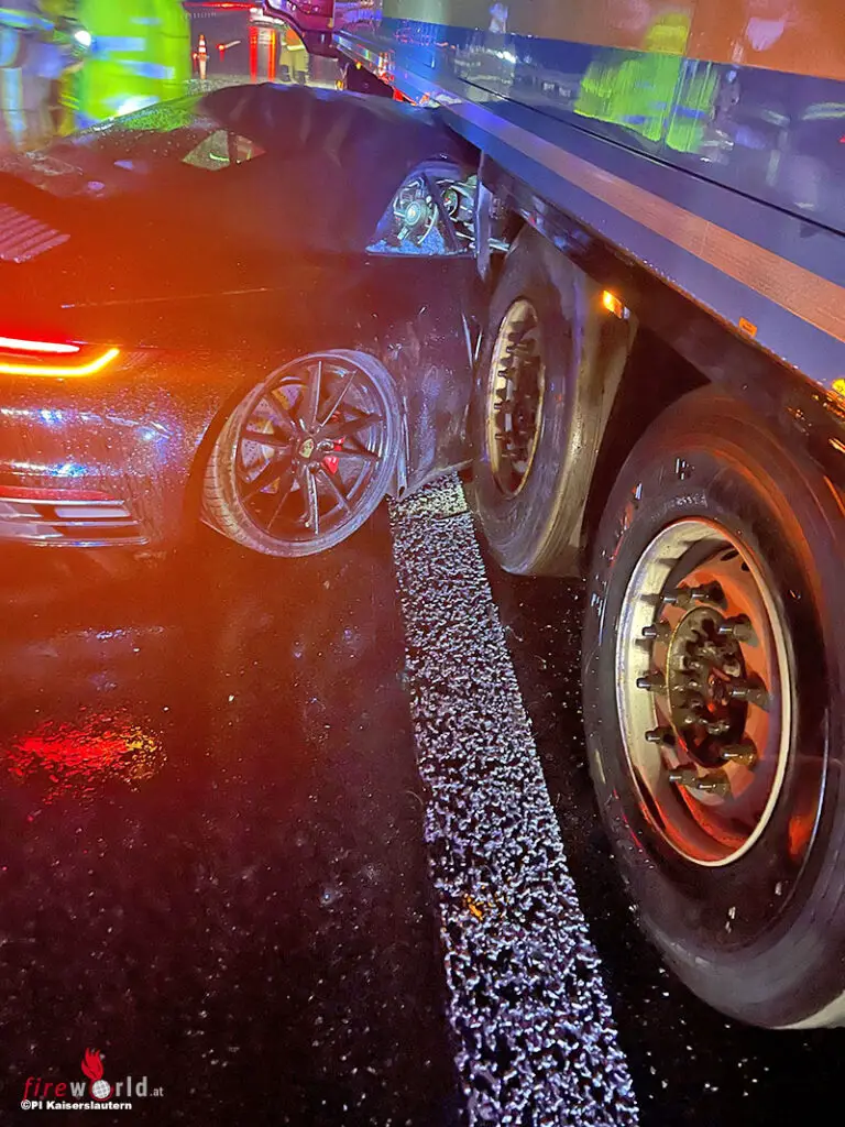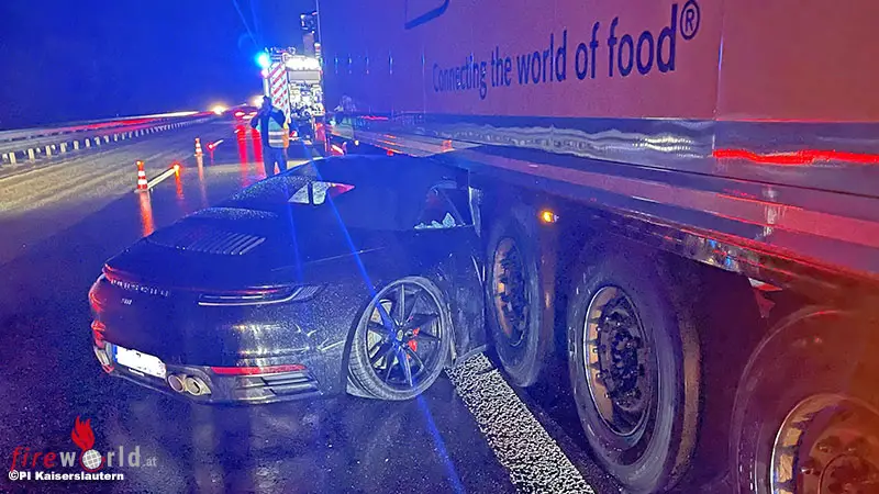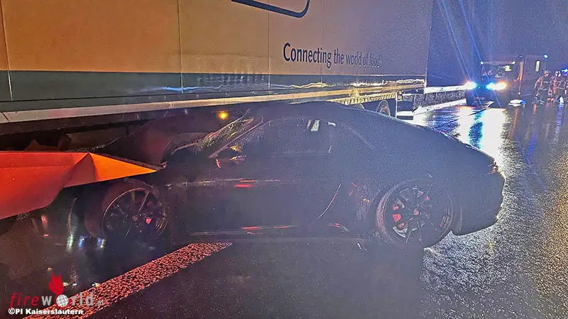 D: Sportwagen schlittert aufgrund von Aquaplaning bei Sembach mittig unter Sattelauflieger