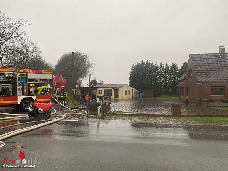 Die Ortsfeuerwehr Wehdel wurde gegen 12:48 Uhr in Wesermünder Straße alarmiert. Hier wurde das Gelände eines Einfamilienhauses überschwemmt. Um hier die Ausbreitung auf das Wohnhaus zu verhindern wurde hier, gemeinsam mit einem Güllefass eines Landwirtes, Wasser abgepumpt.