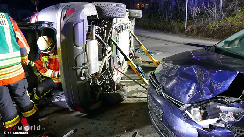 Die Einsatzstelle befand sich direkt im Kreuzungsbereich. Dort war es zu einem Zusammenstoß zweier Pkw gekommen. Beim Eintreffen der Feuerwehr konnte ein Pkw auf der Seite liegend vorgefunden werden.