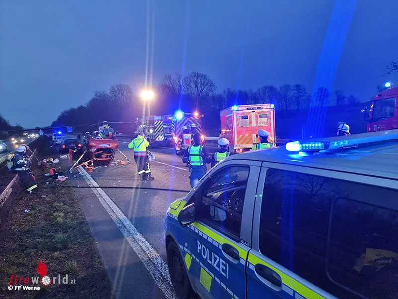 Im Einsatz waren fünf Fahrzeuge [1-RW1-1,1-TLF3000-1,1-ELW1-1,1-HLF20-1] und 22 Einsatzkräfte der Freiwilligen Feuerwehr Werne, ein RTW aus Werne und Kamen, der Rettungshubschrauber Christoph 8 inklusive Notarzt aus Lünen, der Organisatorische Leiter Rettungsdienst aus Lünen und leitende Notarzt aus Unna sowie fünf Streifenwagen der Autobahn Polizei.