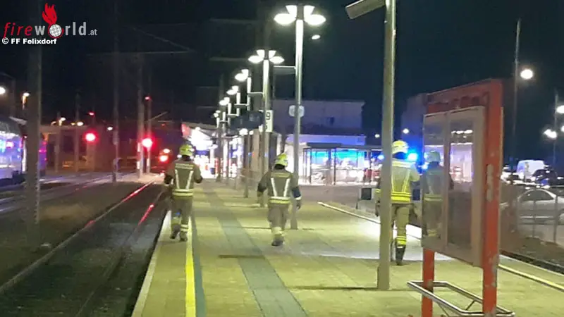 Ein weitere Triebwagenführer, welcher seinen Zug zu diesen Zeitpunkt planmäßig im Bahnhof Felixdorf gehalten hat, unterstützte seinen Kollegen und veranlasste eine sofortige Streckensperrung auf allen Gleisen. Da im unmittelbarer Bahnsteigbereich nichts aufzufinden war, was auf einen Zusammenstoß deuten ließ, ging ein Teil unserer Mannschaft mit den eingetroffenen Kräften der Rettung und der Besatzung eines Notarztwagens zu den Triebwagen, der durch seine Notbremsung ca. 300 Meter außerhalb des Bahnhofsbereich zum Stillstand kam.