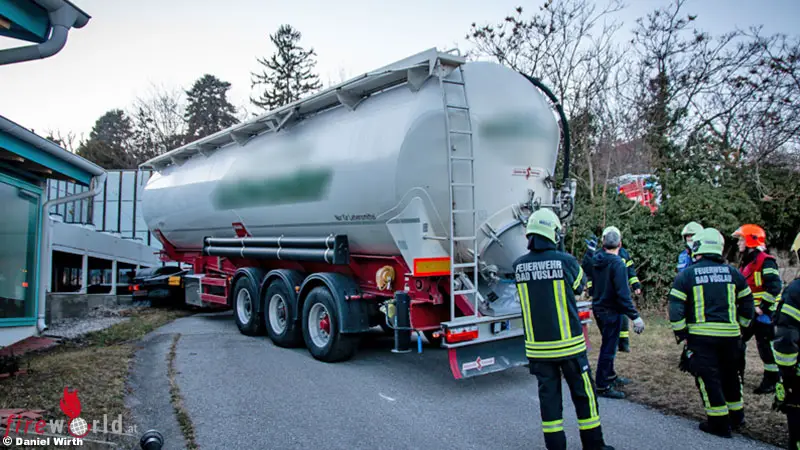 BAD VÖSLAU (NÖ): In den Nachmittagsstunden des 1. März 2022 wurde die Freiwillige Feuerwehr der Stadt Bad Vöslau zu einer Lkw-Bergung alarmiert. Ein 40 Tonnen schwerer Sattelzug blieb im Schotter einer schmalen und steil bergab führenden Hotelzufahrt mit der Antriebsachse stecken.