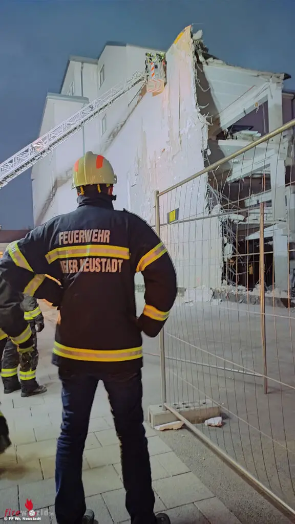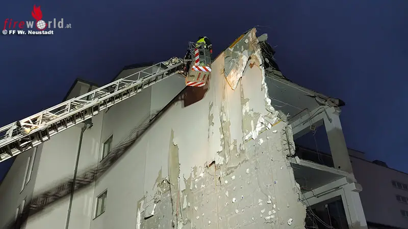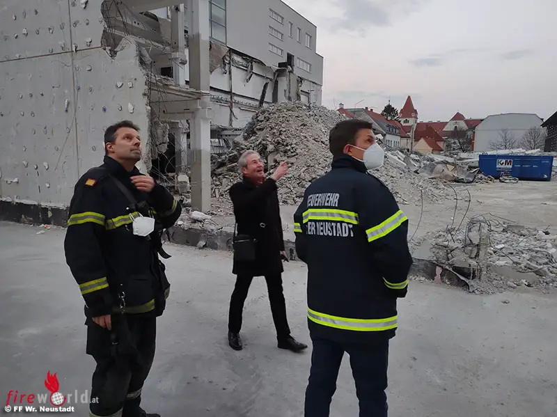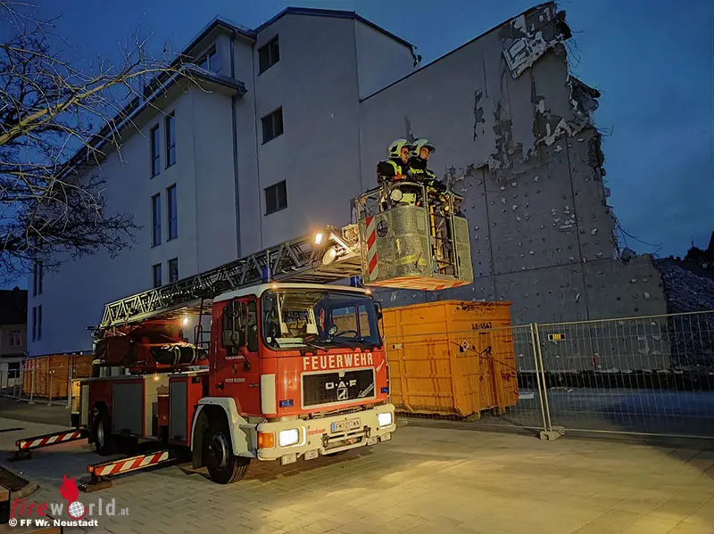 WIENER NEUSTADT (NÖ): Anrufer aus einem benachbarten Hotel meldeten Freitag Nachmittag, 4. März 2022, lose Fassadenteile auf der Baustelle eines ehemaligen Möbelhauses in Wiener Neustadt. Nach Rücksprache mit Magistrats- und Baudirektor wurde entschieden, dass die losen Teile aufgrund von Gefahr in Verzug durch die Feuerwehr entfernt werden. Auf dem Areal werden momentan großflächige Abrissarbeiten für ein neues Großbauprojekt im Zentrum der Statutarstadt durchgeführt.