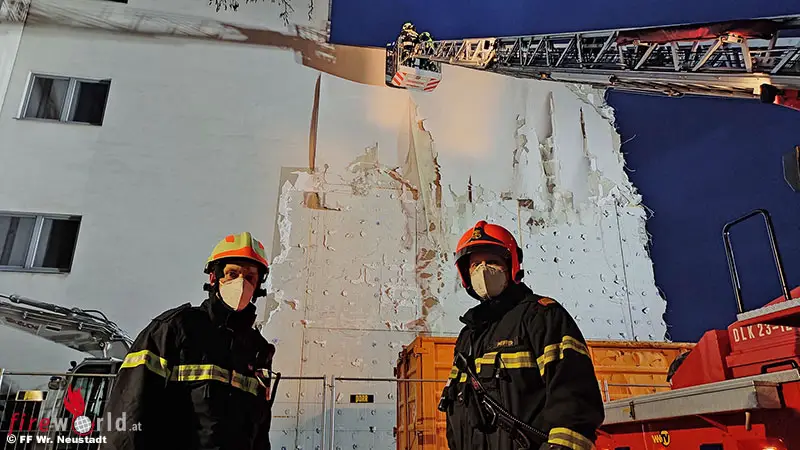 In Anwesenheit von Mag. Biffl und Feuerwehrkommandant BR Christian Pfeiffer wurden die Fassaden- und Dämmteile mittels Drehleiter entfernt. Einsatzleiter BR Christian Pfeiffer lobte die Zusammenarbeit zwischen den Wiener Neustädter Behörden und der Feuerwehr: „Oft kommt es vor, dass die Feuerwehr rasch behördliche Entscheidungen am Einsatzort benötigt. Die ständige Erreichbarkeit der Behördenvertreter, heute Magistratsdirektor Biffl und Stadtbaudirektor Korzil, ist daher sehr wichtig für die Feuerwehr und erleichtert uns die erfolgreiche Einsatzführung zu jeder Tages- und Nachtzeit. Um die Erreichbarkeit noch weiter zu verbessern und dem Magistratsdirektor den sicheren Aufenthalt an der Einsatzstelle zu ermöglichen, wurde er vor einiger Zeit auch mit eigenem Feuerwehrfunkgerät und Einsatzuniform ausgestattet. Für das Einsatzpersonal der Feuerwehr Wiener Neustadt ist dies auch ein wichtiges Zeichen der Wertschätzung, wenn der Behördenvertreter so nah am Einsatzgeschehen auf Augenhöhe teilnehmen.“