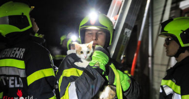 Ein Lkw fuhr auf einem Sattelzug auf und schob diesen auf einen weiteren Lastwagen. Der Fahrer des hinteren Lkw wurde schwerverletzt in seinem Fahrzeug eingeklemmt. Die Feuerwehr befreite diesen aufwendig mit hydraulischem Rettungsgerät aus der deformierten Fahrgastzelle.