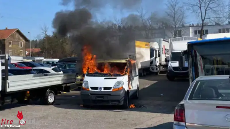 CHAM (SCHWEIZ): Auf einem Parkplatz ist ein Lieferwagen in Brand geraten und vollständig ausgebrannt. Weitere Fahrzeuge wurden nicht beschädigt.