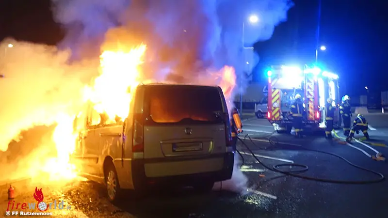 Als die Feuerwehr Rutzenmoos am Einsatzort eintraf, stand der Kleinbus bereits im Vollbrand. Unter Einsatz von schwerem Atemschutz und zwei Hochdruck-Rohren konnte der Brand nach kurzer Zeit gelöscht werden.