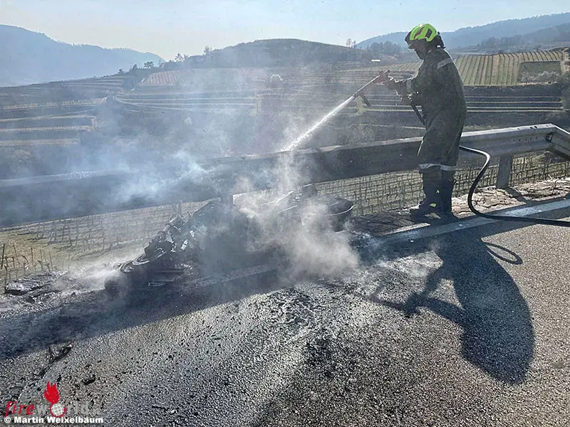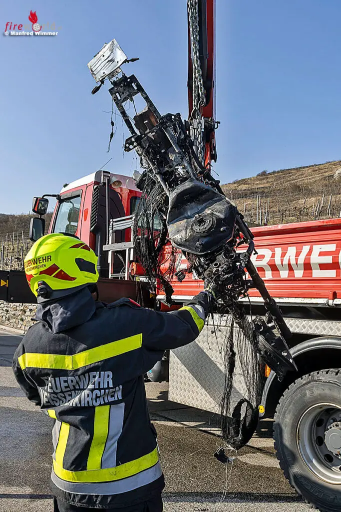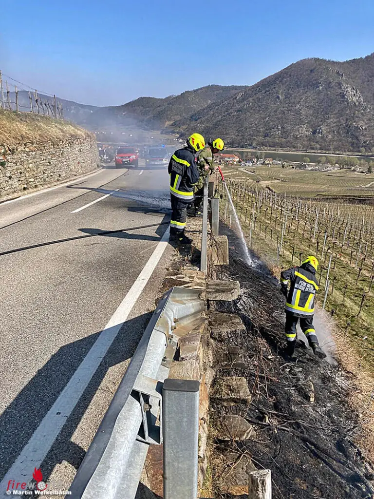 Von der Bezirksalarmzentrale Krems wurden die Feuerwehren Weißenkirchen, Joching und Wösendorf, zu einem Fahrzeugbrand auf die Seiber Straße mit Person im Fahrzeug alarmiert. Beim Eintreffen stellte sich die Lage aber anders da. Rasch konnte das ersteintreffende Rüstlöschfahrzeug Weißenkirchen den Brand des Motorrades und der Böschung mittels Schnellangriffseinrichtung unter Kontrolle bringen und ablöschen.