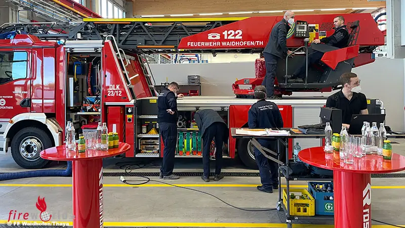 Zu Beginn wurden die noch offenen Punkte aus der erfolgten Abnahme in Karlsruhe und der technischen Abnahme im NÖ Landesfeuerwehrkommando in Tulln abgearbeitet und kontrolliert. Nach einer Produktprüfung am Freigelände gab es für die Teilnehmer eine erste Grundeinschulung auf der Drehleiter.