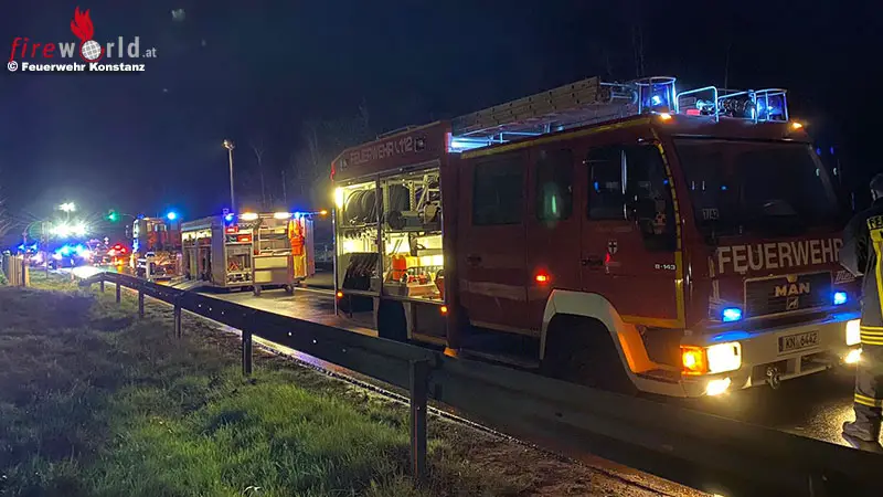 KONSTANZ | SINGEN (DEUTSCHLAND): Am Nachmittag des 8. April 2022 verunfallte ein Lkw auf der Auffahrt der B 33 bei Singen. Dabei wurde der Tank des Fahrzeugs beschädigt, sodass mehrere hundert Liter Diesel ausliefen. Der ausgelaufene Kraftstoff sammelte sich in einem Regenrückhaltebecken in der Nähe.