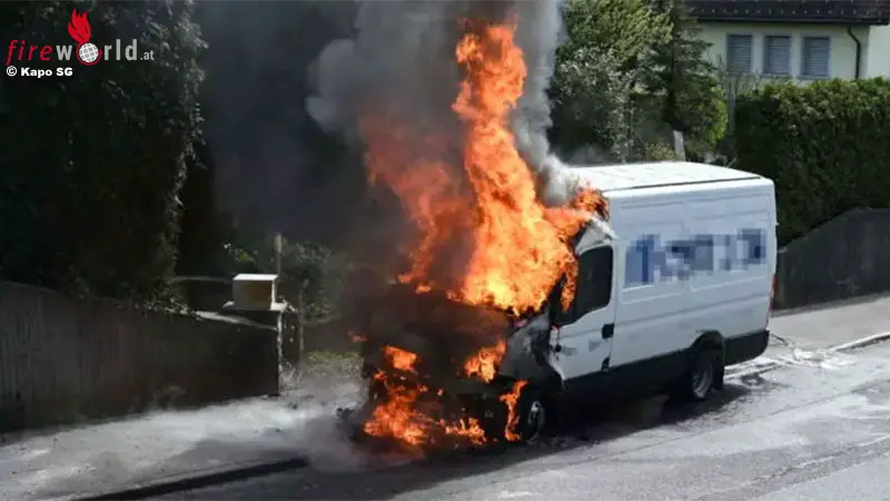 Schweiz: Lieferwagen steht im Frontbereich in St. Gallenkappel in Flammen
