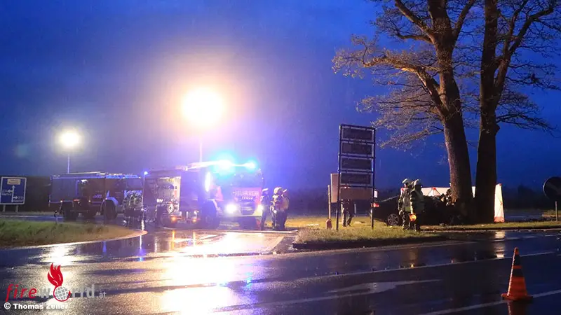 Aus unbekannter Ursache kam er unmittelbar vor der Kreuzung von der Fahrbahn ab und prallte frontal gegen einen im Kreuzungsbereich stehenden Baum. Dabei erlitt er tödliche Verletzungen. Einsatzkräfte der Feuerwehren Spielberg und Sachendorf befreiten den Mann aus dem total beschädigten Fahrzeug.