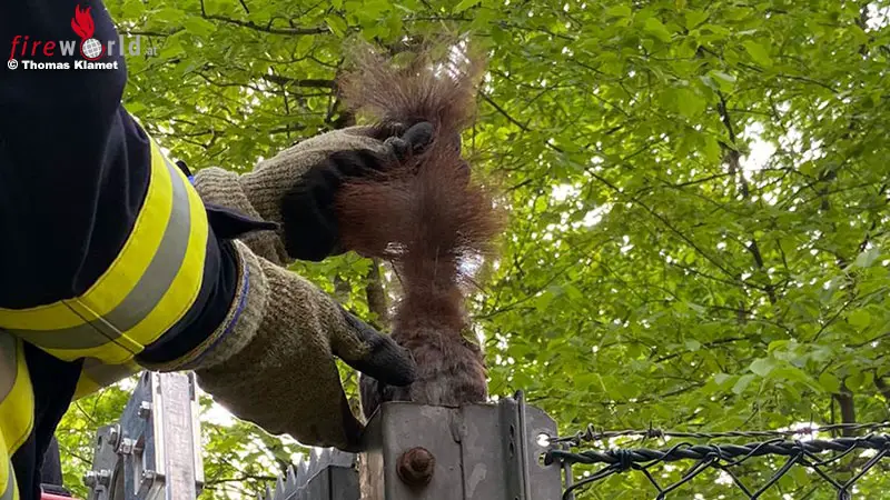 Vor Ort konnten die Einsatzkräfte schnell feststellen, dass das Tier circa 15 cm tief in dem Zaunpfahl feststeckte. Nach dem Aufbau einer Bockleiter konnte mit etwas Geschick und Handwerkszeug das Tier befreit werden. Leider mussten die Einsatzkräfte feststellen, dass der Zaunpfahl mit Regenwasser gefüllt war und das Eichhörnchen keine Lebenszeichen mehr von sich gab.