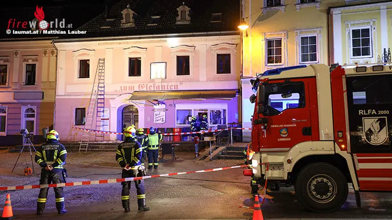 Die Feuerwehr wurde in der Nacht auf Samstag auf den Marktplatz in Lambach alarmiert, nachdem bei einem Gebäude ein großes Fassadenelement auf den Marktplatz gestürzt ist. Eine erste Erkundung durch die Einsatzkräfte der Feuerwehr ergab, dass weitere Teile der Fassade abzustürzen drohen beziehungsweise deutliche Risse im Fassadenstuck zu sehen sind.