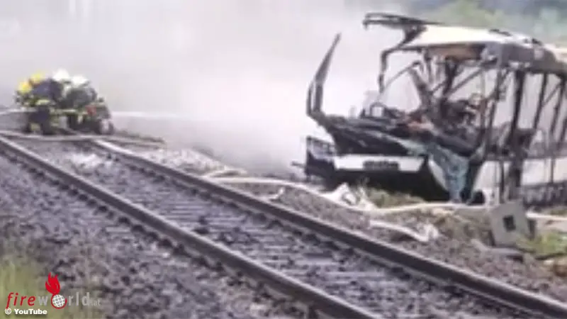 D: Autobus auf Bahnübergang von Zug erfasst und in Flammen aufgegangen → mehrere Schwerverletzte