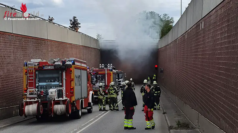 BOCHOLT (DEUTSCHLAND): Die Feuerwehr Bocholt wurde um 18.49 Uhr des 30. Mai 2022 zu einem Fahrzeugbrand im Westringtunnel alarmiert. Am Ende stellte sich die Situation als unangekündigte Alarmübung heraus.