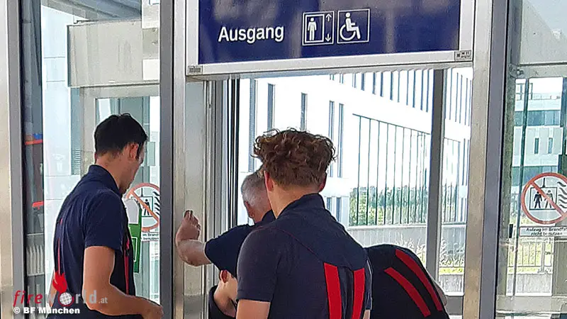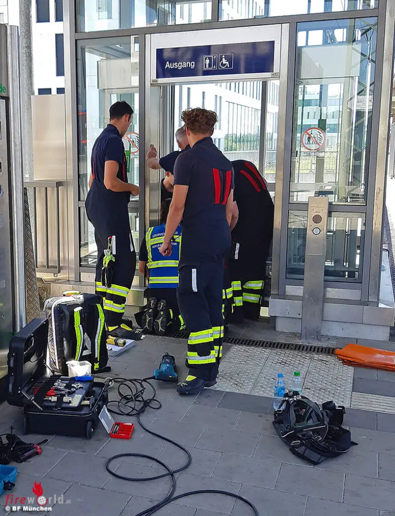 Nachdem sich die beiden Männer bereits über zwei Stunden in dem sonnenbeschienenen Aufzug befanden, wurde die Feuerwehr München hinzugezogen. Gemeinsam mit dem anwesenden Sicherheitsdienst versuchten die Einsatzkräfte nach der ersten Kontaktaufnahme den Aufzug so zu verfahren, dass die Eingeschlossenen aussteigen können. Diese Maßnahmen scheiterten aber – trotz aller Kunstgriffe.