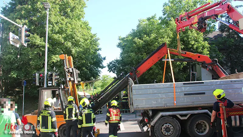 Bei dem Aufprall, löste sich der Greifer des Ladekrans und fiel auf der Gegenfahrbahn zu Boden. Um 16:29 Uhr alarmierte daher die Polizei die Freiwillige Feuerwehr Maria Enzersdorf zur Lkw-Bergung in die Franz Josef-Straße.