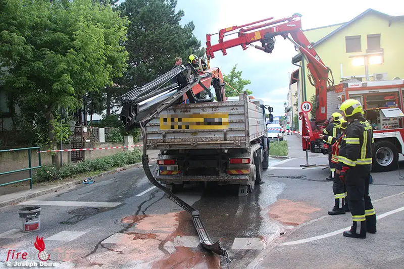 Während die Polizei die Straße für die Dauer des Einsatzes gesperrt hielt, rückte die Feuerwehr mit insgesamt sechs Fahrzeugen zum Einsatzort aus und begann damit ausgetretenes Hydrauliköl zu binden. Dieses wurde später durch eine Fachfirma im Zuge der Straßenreinigung sachgemäß entfernt. Mithilfe eines Hubstaplers der Firma des verunfallten Fahrzeugs sowie dem Kran des schweren Rüstfahrzeugs der Freiwilligen Feuerwehr Maria Enzersdorf konnte der schadhafte Kran abgelegt werden.