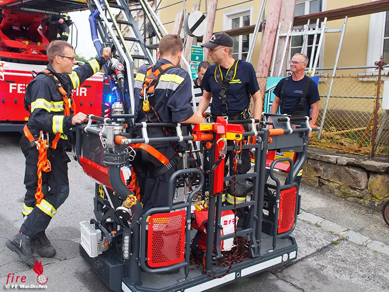Zusätzlich wurde die Drehleiter vor dem Wohnhaus in Stellung gebracht und zwei Mitglieder vom Korb auf das Dach abgeseilt. Diese beiden Mitglieder wurden ständig von der Drehleiter gesichert und führten die Befestigung der Plane bzw. das Einhängen von Dachziegeln durch. Mit diesen Maßnahmen konnte ein weiterer Wassereintritt in das Wohnhaus verhindert werden.