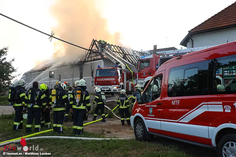 WAIZENKIRCHEN (OÖ): Zwölf Feuerwehren standen bzw. stehen Mittwochabend, 6. Juli 2022, bei einem Großbrand auf eines Vierkanthofes in Waizenkirchen (Bezirk Grieskirchen) im Einsatz.