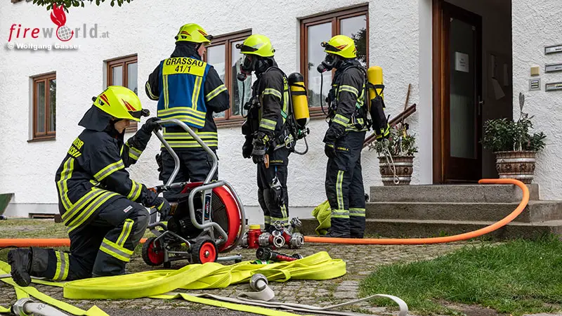 STAUDACH-EGERNDACH (BAYERN): Am Donnerstag, 21. Juli 2022, wurden die Feuerwehren Staudach-Egerndach und Grassau gegen 10:30 Uhr von der Integrierten Leitstelle mit dem Einsatzstichwort „Kellerbrand“ zum Rathaus in den Schulweg alarmiert.
