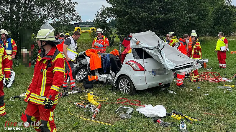Durch die Wucht des Aufpralls wurde der Kleinwagen in ein angrenzendes Feld geschleudert und kam völlig demoliert zum Stehen. Alle Insassen des Kleinwagens wurden im Fahrzeug eingeklemmt und mussten durch die Freiwilligen Feuerwehren Freilassing und Saaldorf aus dem Wrack geborgen werden. Für die Lenkerin kam jedoch jede Hilfe zu spät. Sie verstarb noch an der Unfallstelle.