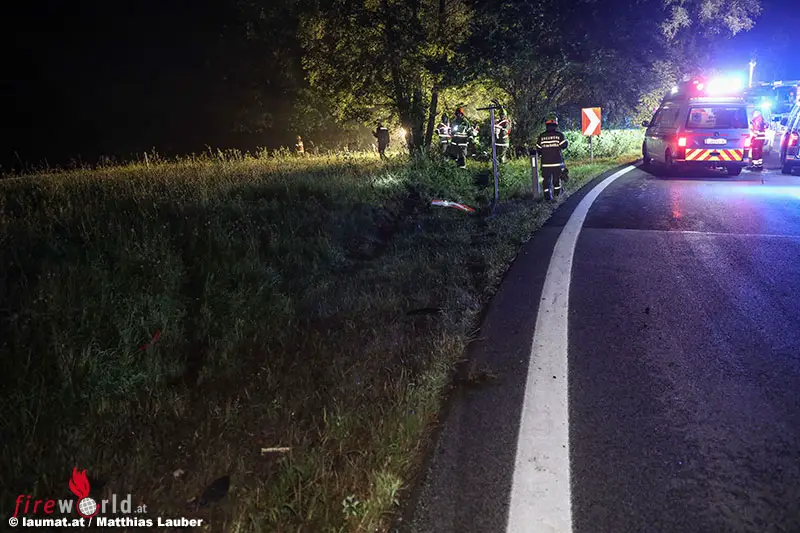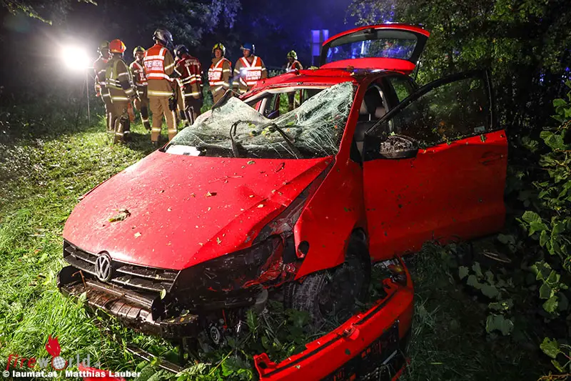 Der Unfall ereignete sich im Bereich der Abfahrt von der A8 Innkreisautobahn in Fahrtrichtung Knonten Voralpenkreuz bei Haag am Hausruck. Ein Pkw ist aus bisher unbekannter Ursache von der Fahrbahn abgekommen, durch eine Baumgruppe gefahren, wo der Wagen mehrere Bäume umgerissen hat. Dahinter kam das Auto dann schwer beschädigt zum Stillstand.