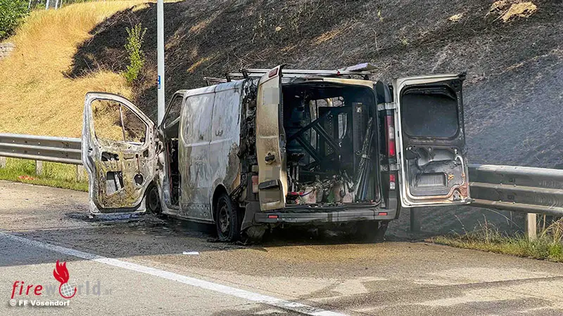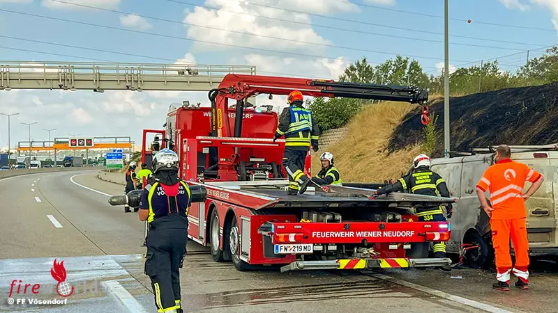 Während der Anfahrt wurden die Kameraden von der Bezirksalarmzentrale Mödling informiert, dass der Kleintransporter mehrere Gasflaschen geladen hatte. Zeitgleich wurde die Freiwillige Feuerwehr Vösendorf zu einem weiteren Einsatz, einer Brandmelderauslösung in einem Gewerbeobjekt alarmiert. Beim Eintreffen am Einsatzort stand das Fahrzeug auf dem Pannenstreifen in Vollbrand. Die Flammen hatten bereits auf die nahegelegene Böschung übergegriffen.