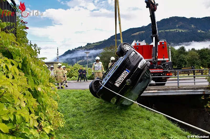 KITZBÜHEL (T): Am Sonntag, den 4. September 2022, gegen 8.00 Uhr, wurde die Freiwillige Feuerwehr Kitzbühel zu einem schweren Verkehrsunfall am Malernweg alarmiert. Ein Pkw war in den angrenzenden Ehrenbach gestürzt, wobei sich eine verletzte Person im Auto befand.