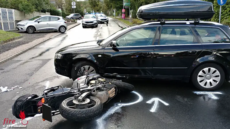 PINKAFELD (BGLD): Am Nachmittag des 11. September 2022 wurde die Feuerwehr Pinkafeld mittels Rufempfänger zu einem Verkehrsunfall „Pkw gegen Motorrad2 in die Grazerstraße alarmiert.