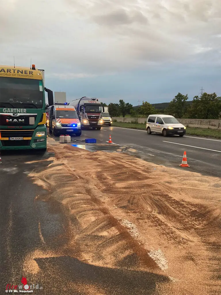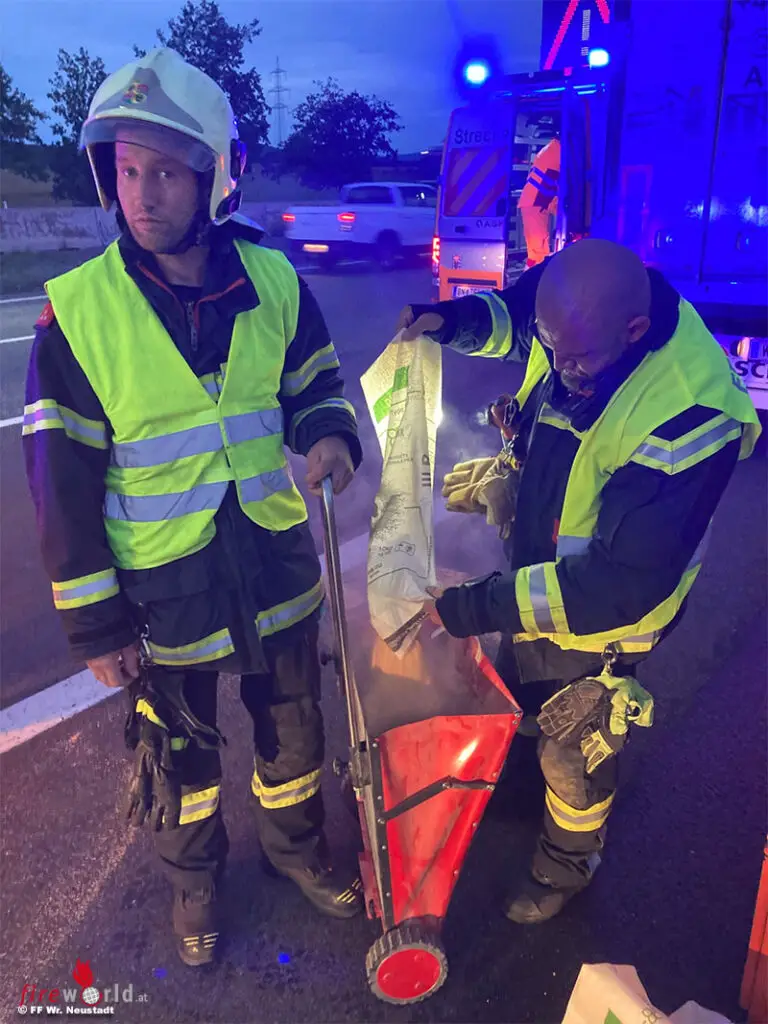 WIENER NEUSTADT (NÖ): In den frühen Morgenstunden des 14. September 2022 wurde die Feuerwehr Wiener Neustadt zu einem leckgeschlagenen Dieseltank auf die A2 gerufen.