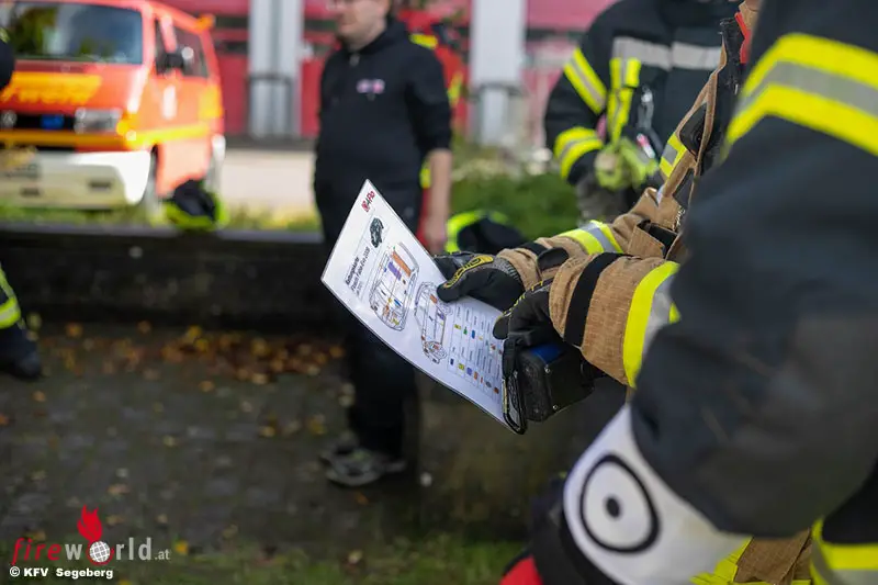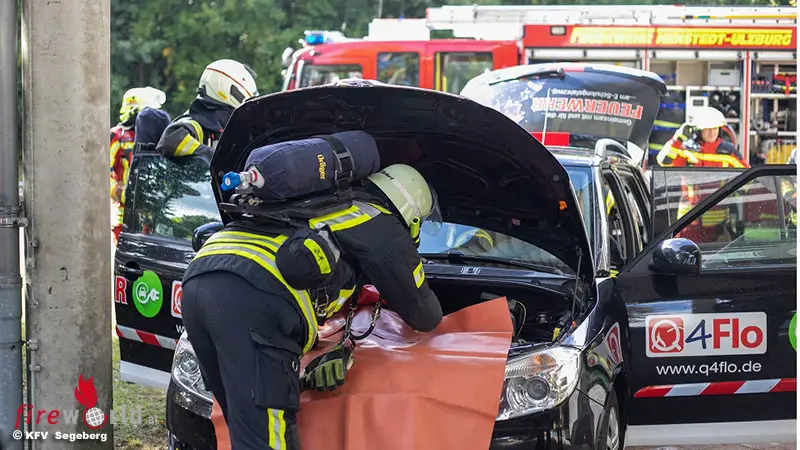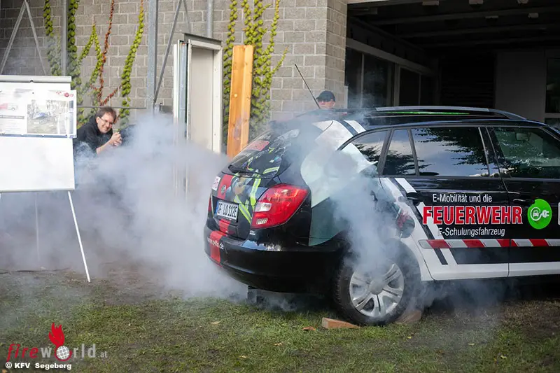 ,,Aufgrund der elektrischen und chemischen Gefahren ist es den Feuerwehren derzeit nicht möglich, an einem brennenden E-Fahrzeug zu trainieren“, berichtet Daniel Rothmaier von der Firma „Q4Flo“. Genau aus diesem Grund wurde von „Q4Flo“ ein Schulungsfahrzeug entwickelt, an dem 12 Gefahrensituationen trainiert werden können.
